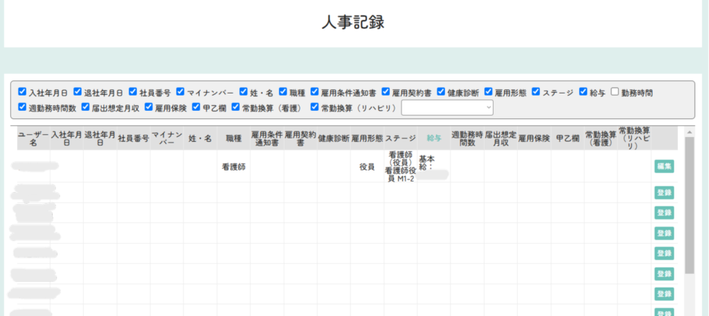 この【人事記録】機能では、職員の入社・退社の履歴、ステージランクや雇用形態などの人事関連情報を一元管理できます。