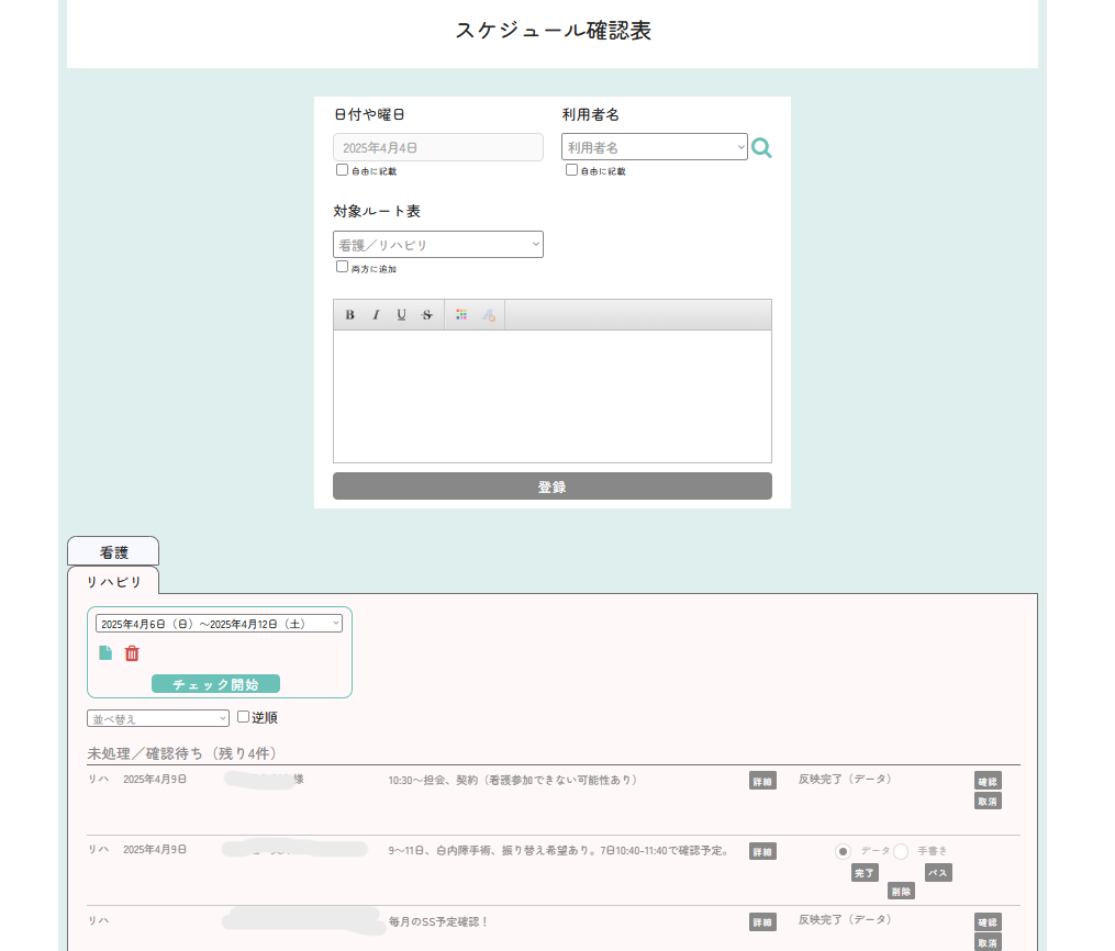 【確認表】機能では、利用者様に関するスケジュール上の連絡事項を一元管理。