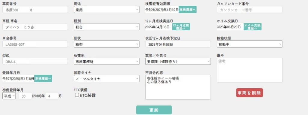 この機能では、社用車・自家用車の区別を問わず、点検履歴や給油記録、故障・不具合の報告など、