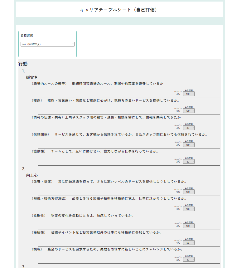 この機能では、スタッフ自身が行動やスキルについて自己評価を行い、それに対する上司からの他者評価も記録されます。