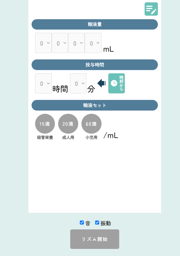 この機能では、輸液量・投与時間・使用する輸液セットの種類を入力するだけで、適切な滴下数が自動で計算されます。